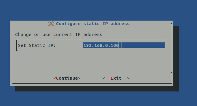 <figure><img src="https://3575829558-files.gitbook.io/~/files/v0/b/gitbook-x-prod.appspot.com/o/spaces%2FagtmuqnpaWXODK8OyTU3%2Fuploads%2Fgit-blob-44c4256a96263d575296ff70816061de27d65b5a%2Fup4_dialog_1_static_ip.png?alt=media" alt=""><figcaption><p>Setzen einer statischen IP-Adresse (vorausgefüllt mit aktueller [dynamischer] IP-Adresse). Weiter mit &#x3C;Continue></p></figcaption></figure>