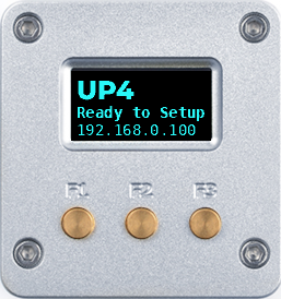 Die UP4 zeigt ihre aktuelle IP-Adresse und die Bereitschaft fürs Setup.