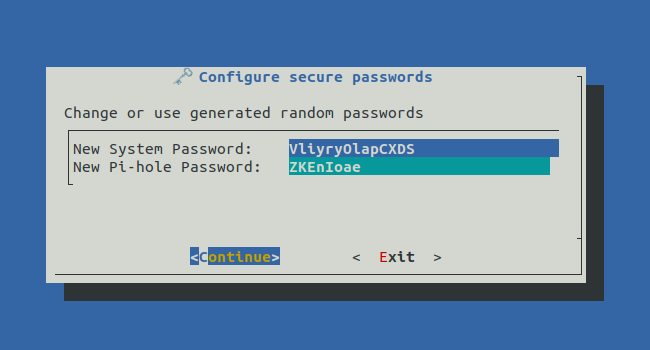 <figure><img src="https://3575829558-files.gitbook.io/~/files/v0/b/gitbook-x-prod.appspot.com/o/spaces%2FagtmuqnpaWXODK8OyTU3%2Fuploads%2Fgit-blob-c5b11e5522e89a3c7f715e4a635d841c12eb39d1%2Fup4_dialog_2_passwords.png?alt=media" alt=""><figcaption><p>Setzen des SSH Passwort ("System Password") und Pi-hole Admin Passwort ("Pi-hole Password").<br>Dialog wird mit sicheren, zufälligen Passwörtern vorausgefüllt. Weiter mit &#x3C;Continue></p></figcaption></figure>